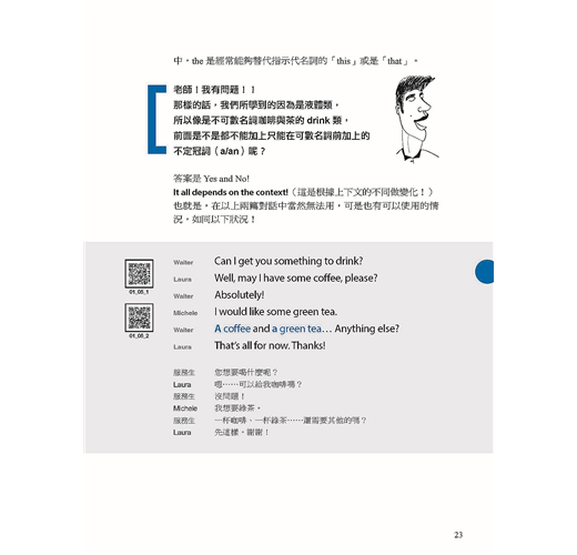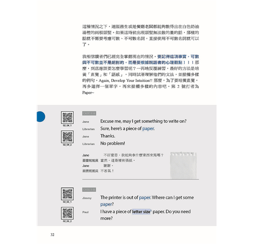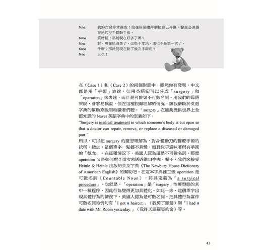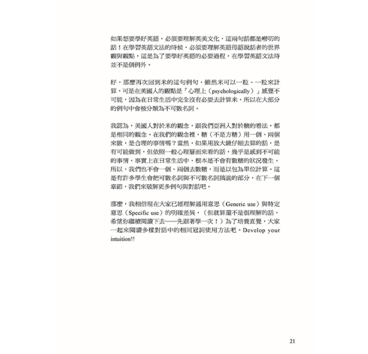 ◆ 用美國人的思考觀點,詳細解析英語文法概念作者透過輕鬆、幽默的敘述講解美國人的思考觀念,帶著讀者一起學習讓人摸不著頭緒的文法概念,讓讀者能在面對不熟悉的文法概念時,以美國人的價值觀來判斷文法觀念。例如,在判斷名詞是否可數時,不能透過死記硬背,要用生活上的情境、常理來理解為什麼在這個情況下的名詞要用可數、不可數。之後讀者在使用英語時,可以用清晰的思緒來架構所要表達的英語,講出正確的文法。