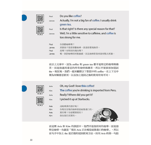 ◆ 用道地的美國日常生活對話,學習文法正確的使用方式除了詳細的文法解析,本書還收錄多篇道地的英語對話,每篇文法章節根據不同的文法概念設計不同的英語對話,讓讀者在理解文法之後,可以馬上閱讀生活對話中正確的文法使用方式。唯有透過會話、例句的情境,才能徹底了解相關文法,因此,這些句子根據實際情境而寫出來的。這些會話之中蘊含著美國人的思考方式和情感表達,因此比起單純用來學習文法,這些會話例句具有更深層的意義,作者強調只要文法運用正確,就能流暢地說英文,提升會話能力。
