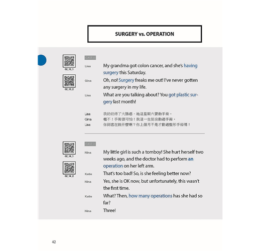 ◆ 收錄美國人慣用表達與生活用字,學會最道地的英文表達對話中也補充許多美國人慣用表達、生活用字,例如:coke-bottle glasses(鏡片很厚的眼鏡)、toss and turn(翻來覆去、睡不著)、take off(離開)等,這些表達都是非常道地的美式英語表達,在平時學習英文的書籍可能不太常見,因此本書讓讀者能夠一邊學習名詞相關的文法,一邊記住學校不會教的英語表達,讓你的會話能力達到美國人都會讚嘆的境界!