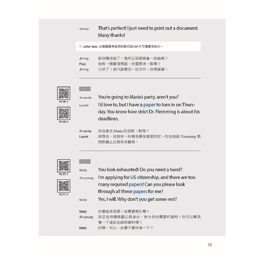 ◆ 以QR碼線上線上音檔方式,收錄慢版及自然版會話 MP3,一邊聽、一邊唸,學習更有效書中的每一段會話旁都附上了 QR 碼,只要用手機一掃就能聽到道地美式發音的對話 MP3。特別的是,本書收錄了兩個版本的 MP3,分別是排除了大部分的情感、口音、連音且唸得比平常說話速度更慢的慢版,以及用美國人平常說話時的語速、語調、連音及語感自然對話的自然版。慢版是針對將個別單字準確發音,仔細聆聽會對培養英文聽力很有幫助,而聆聽自然版則是能聽到相當生動的會話。可依照自己當下的需求選擇適合的音檔,一邊聽、一邊唸,同步提升英文聽力和會話能力。本書亦提供可一次下載全書 MP3 的 QR 碼,不需註冊會員,或額外安裝自己不熟悉的播放 APP,省去每次聽音檔都要掃描的麻煩!(註:由於 iOS 系統對檔案下載的限制,iPhone 用戶需升級至 iOS 13 以上,方可使用全書完整打包下載連結。)