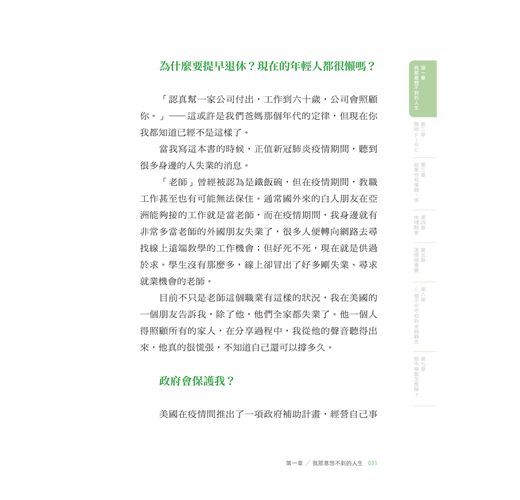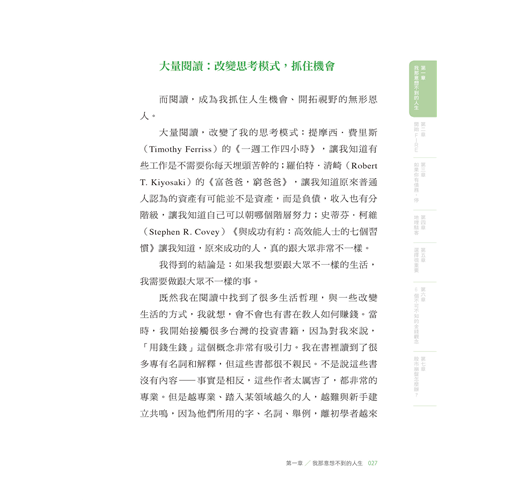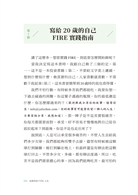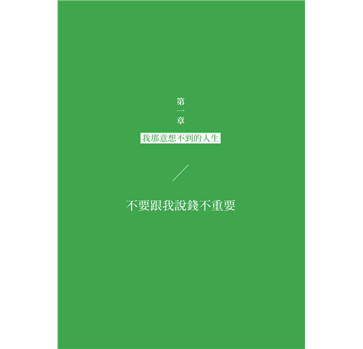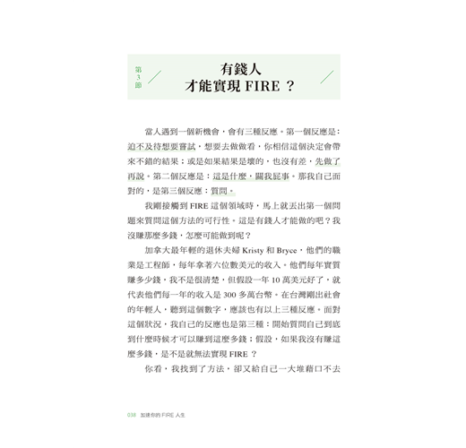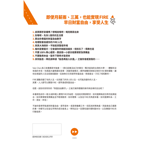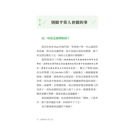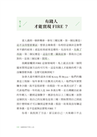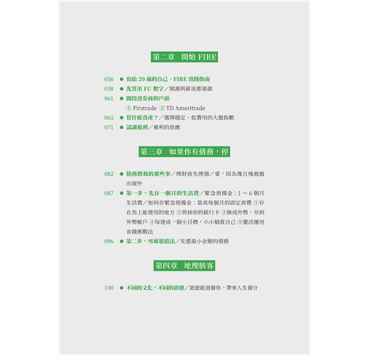 〈好評推薦〉 〈作者序〉因為這個人生,是你的 為什麼我要寫這本書?/什麼是「FIRE」?/這本書適合誰?/這本書不適合誰?/為什麼你要聽我的話? 【第一章】 我那意想不到的人生 ◎別做平常人會做的事 /這一切是怎麼開始的?/大量閱讀:改變思考模式,抓住機會 ◎FIRE是什麼鬼? /終於踏出第一步/為什麼要提早退休?現在的年輕人都很懶嗎?/政府會保護我?/乏味無意義的工作/為錢工作vs. 因為興趣工作/ ◎有錢人才能實現FIRE? /背後的數學其實很簡單/你的財富自由數字 ◎4%法則 /什麼是有效行動?/4%法則現在還有效嗎? 【第二章】 開始FIRE ◎寫給20歲的自己•FIRE實踐指南 ◎先算出FU數字 /開源與節流都要做 ◎開投資券商的戶頭 ◆①Firstrade◆②TD Ameritrade ◎買什麼資產? /選擇穩定、低費用的大盤指數 ◎認識複利 /複利的效應 【第三章】 如果你有債務,停 ◎債務教我的那些事 /理財前先理債/愛,因為幾百塊被拋出窗外 ◎第一步,先存一個月的生活費 /緊急預備金:1~6個月生活費/如何存緊急預備金:當成每個月的固定消費 ◆①存在馬上能使用的地方◆②剪掉你的銀行卡◆③換成外幣,存到外幣帳戶◆④每達成一個小目標,小小犒賞自己◆靈活運用省錢挑戰法 ◎第二步,雪球還債法 /先還最小金額的債務 【第四章】地理駭客 ◎不同的文化,不同的啟發/旅遊能滋養你,帶來人生養分 ◎Location,決定錢的大小 /什麼是「地理駭客」?/同樣是英語老師,薪資大不同/到東南亞工作,只能領當地人的薪資?◆①語言問題◆②雇用外國人成本較高/學歷不代表任何事 ◎生活品質膨脹的陷阱 /別因為錢變大了,就覺得需要買 ◎如何當一個成功的地理駭客? /更認真記帳/去當地人購物的地方/不要住在商圈 【第五章】選擇很重要 ◎選擇大學 /大學學費知多少 ◎選擇科系 /擇你所愛/跟隨大眾/我的作法/你的選擇比你想的還要多 ◎選擇工作 /什麼樣的工作該避開?/該不該跳槽? ◎挑選伴侶 /金錢觀要相似 【第六章】6個不可不知的金錢觀念 ◎你的房子不是資產 /買房比較划算? ◎你只需要兩種保險 /醫療險+意外險/你的投資組合就是你的壽險 ◎你該買那一杯拿鐵嗎? /衡量你最想要的是什麼? ◎促銷真的讓你省了錢? /FIRE 族怎麼使用促銷?/如果沒有錢買6份,你其實買不起 ◎我該買這個嗎? /確認偏誤 ◎該把錢存在哪家銀行? /沒有人透過存錢致富 【第七章】股市崩盤怎麼辦? ◎清楚的投資策略 /大跌才是股市的週年慶:漲了225%的特斯拉 ◎保護自己的救命金 /不賣本金,只領股息/不賣本金,運用股息,連動緊急預備金 ◎最壞的打算 〈致謝〉謹慎挑選你的朋友