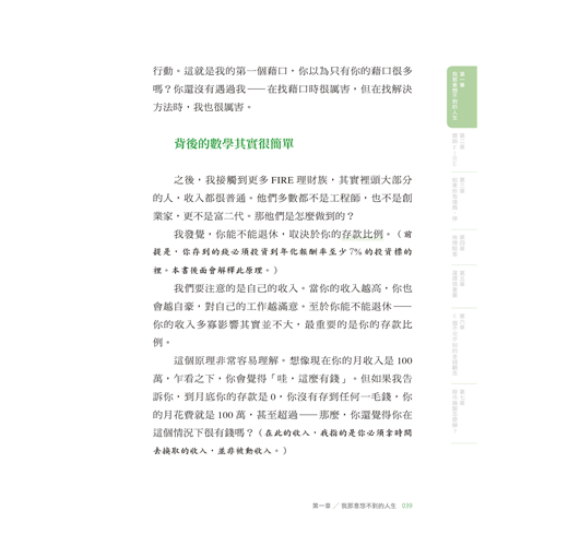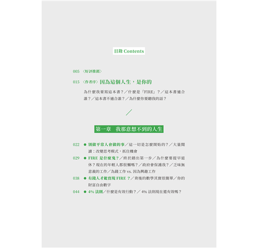 〈好評推薦〉 〈作者序〉因為這個人生,是你的 為什麼我要寫這本書?/什麼是「FIRE」?/這本書適合誰?/這本書不適合誰?/為什麼你要聽我的話? 【第一章】 我那意想不到的人生 ◎別做平常人會做的事 /這一切是怎麼開始的?/大量閱讀:改變思考模式,抓住機會 ◎FIRE是什麼鬼? /終於踏出第一步/為什麼要提早退休?現在的年輕人都很懶嗎?/政府會保護我?/乏味無意義的工作/為錢工作vs. 因為興趣工作/ ◎有錢人才能實現FIRE? /背後的數學其實很簡單/你的財富自由數字 ◎4%法則 /什麼是有效行動?/4%法則現在還有...