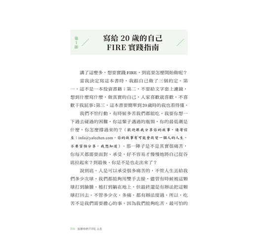 ◆因為這個人生,是你的 哈囉,你好,我是Yale Chen。在你購買或是閱讀這一本書之前,我要先跟你預告一些事情。 首先,在這本書裡,我希望以朋友的身分與你聊天,我的語氣在某一些章節裡,可能會很優雅有禮貌;但在另一些激動的章節中,我可能會忘記修飾自己。你不會看到華麗的修辭,或是很專業的中文文法或成語,因為那不是我。你在書中看到的語氣,就是我平時說話的方式。如果看不慣,我並不會感到抱歉。 第二,我不會告訴你怎麼做,我不相信傳教。我只相信,當我活出最好的自己,就會吸引志同道合的人,會有人開始因為你的行為而受到影響,也會有很多人的生活開始因為你──活出自己──而改變。在這本書裡,我只會跟你分享我自己的生活方式,我如何做選擇、如何投資,一切的角度都是以分享的方式去呈現。我不會跟你說,你一定要做什麼,一定要買什麼。 第三,這不是一本投資書籍,這本書是一種生活態度。我不會在這本書裡教你怎麼投資,只會分享我會怎麼做。如果你想學習怎麼投資,請報名投資課程。 這個世界上有上萬種生活方式,而這本書介紹的是「FIRE」族(Financial Independent Retire Early,意為「財務獨立、提早退休」)的生活態度。我會陸陸續續介紹提早退休族會怎麼做人生的選擇:從大學的科系選擇到每日生活的消費,甚至是投資標的的選擇──我會告訴你,如果是我的話,我要怎麼做才能夠讓自己達到財富自由、提早退休這個目標。 ◎為什麼我要寫這本書? 我踏入提早退休領域已經有3年多的時間。其實我很久之前就要想寫書──我相信這也是很多人的人生夢想,就是希望未來可以寫書,而我也是。過去幾年來,有非常多的出版社聯繫我,希望我可以出書。我也考慮了很久,問了自己很多次,我到底準備好了嗎?如果我現在寫書,到底要寫什麼。也因為這樣,我推辭了好多次的出書邀約。 那麼,為什麼我現在決定要出書呢?因為我相信,我現在已經有個故事要跟你分享。過去,如果我寫書,只是為了出書而寫,這也是很多網紅在做的事:為了出書而出書。但今天,我早上五點起床,在電腦桌前坐下,眼睛都睜不開,已經喝了兩杯咖啡;為了不要打瞌睡,還在眼睛下方抹了一點精油──因為我相信,我終於有故事要跟你分享。 我很慶幸能夠在YouTube和Instagram上擁有非常可觀的追蹤人數,每天都收到非常多的私訊,詢問我對於他們即將要做的人生決定有什麼建議。如果你曾經私訊過我,應該知道我的答案,其實都是反問你:「你要什麼?」我不會直接告訴你我的想法,只會問你──「你到底要什麼」。因為說實在,我怎麼想其實並不重要;重要的是「你」怎麼想,「你」想要怎麼做,「你」要不要做。重要的是:你。 我希望這本書能夠啟發你,讓你了解原來人生有很多種生活方式,不是只有傳統要求我們過的那種人生。我希望,在讀完這本書後,你會發現:「朝九晚五、找一份穩定的工作、工作到65歲、腳踏實地、認真賣命」,不是唯一的選擇。 再一次聲明:我不會告訴你,你應該怎麼過生活,即使你從這本書裡沒有得到任何幫助,我也希望在閱讀過後,你可以給自己一個機會──一個活出框架外的機會,因為這個人生,是你的。 ◎什麼是「FIRE」? FIRE是英文「Financial Independent Retire Early」的縮寫,中文譯為:財富自由,提早退休。這個族群裡的人透過提高收入,加上降低支出,將存到的錢投資到能夠產生現金流的資產,讓自己在非傳統的退休年齡提早退休,開始過自己想要的生活。有人在達到財富自由後,仍繼續工作,單純是因為想要消磨時間或興趣;有人則在達到目標時放手一搏,去追求自己真正想要的事物。 「FIRE 族」在歐美國家已有上百萬人,他們正在活出自己的自由態度,在台灣目前仍然是很新的一個概念。 「提早退休族」並不是無所事事的懶鬼,也不是沒有志向的年輕人,而是知道在這個世界上除了工作之外,還有太多事值得我們投入更多的時間,來讓自己的生活更加精采。 有些人選擇提早退休去環遊世界,將時間花在了解不同的文化;有些人提早退休是想追求創業人生,因為上班時沒有足夠的時間追夢,但退休後就有非常多時間為創業衝刺;有些人提早退休是為了陪伴家人,這種人多半是有小孩的爸媽,他們覺得小孩長得太快,如果把時間都拿去工作,可能轉眼間孩子就成年離家了;有些人即使達到了提早退休的目標,仍然持續工作,因為他們真的太熱愛工作了,但這個時候已經不再是為金錢而賣命。