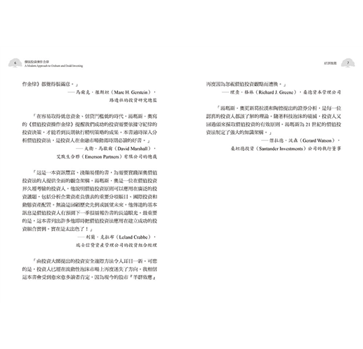 「在這個金錢和信用氾濫的年代,這本書提醒我們,成功的投資有賴長期審慎小心,憑藉紀律與策略做好投資決定。這本書非常出色,對價值投資做出透徹分析,不可不讀,尤其是在這種金融動盪的時代。」──大衛.馬修(David Marshall),愛默生合夥投資公司總裁