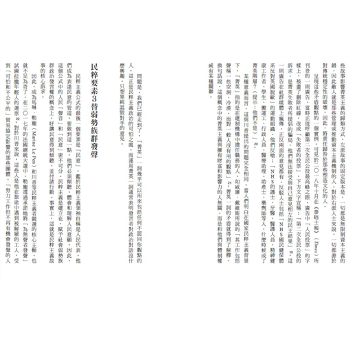 民粹主義的政治本質,比起以上簡短的概述更複雜得多。很多因素促成當今備受重視的地位,比起二○一六年發生的事件要更早幾年,甚至幾十年,因此絕對不是新趨勢。同樣的,民粹主義的高調姿態不見得反映了社會的影響力,儘管某些地區的人日益感覺,社會的主要政治戰線正從傳統的左右對立轉移,很快將被體制派與反體制派的對立所取代。然而,本書重點不是探討整體現象,而是民粹主義的政治風格,關注民粹主義政客用來說服選民的特定論述。在這方面,公式非常簡單,民粹主義本身就是一個簡明扼要的敘述,由三個非常簡單的基本要素構成,每個要素都有一個關鍵字代表。