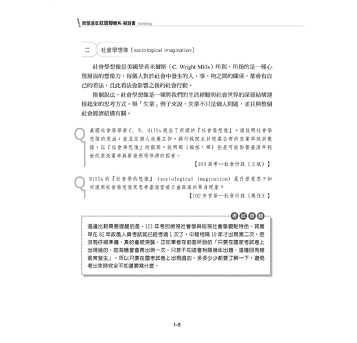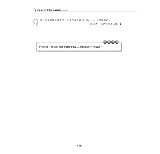 來說說解題書與體系書有何不同吧!「解題書」首重解題內容,所以對於很多內文解釋與文章編寫的篇幅就不會太大;「體系書」是幫助同學了解社會學各章節內容,所以首重內文文章篇幅,但對於解題內容只能作重點提示。