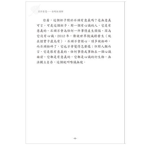 你看,這個杯子對於石頭有意義嗎?毫無意義可言。可是這個杯子,對一個有心識的人,它是有意義的。石頭不會為任何一件事情產生煩惱,因為它沒有心識。2012 年,傳說世界毀滅將發生(現在證實子虛烏有),石頭不會煩心,頂多被粉碎,而石頭粉碎了,它也不會覺得怎麼樣;但對人類而言,它是很有意義的。任何事情或事物在一個心識面前,它都是有意義的,它都是心識的衍生物,無法獨立自存,這個就叫唯識無境。