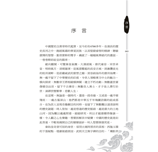 秦始皇奇貨可居的身世、項羽火燒阿房宮的真相、西施玉環的下落疑點、嵇康被殺原因、武則天立無字碑的目的、「燭影斧聲」與宋太祖死因、和親政策背後的政治目的、外戚亂政的實質、樓蘭古國沈沒因由、桃花源仙境身在何地、水滸紅樓作者今何在……一個個未解懸案、一串串歷史怪圈,伴隨著華夏千年的演進,牽涉中土上下內外,推動歷史的進程,激發著後人強烈的求知慾。