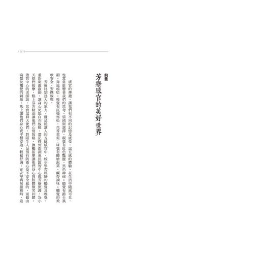 我們有著五感,聽覺、觸覺、嗅覺、味覺、視覺,每一種感受,都是生命中很重要的經歷和回憶;可惜的是,忙碌、壓力、工作、家庭等等原因,使得我們愈來愈麻木,接踵而來的就是無法放鬆、不安、身心疲憊,忘了自己的感受,忘了情感的連結,甚至忘了對所愛的人表達關心。讓我們深呼吸,放慢腳步,重新為自己開啟更好的生命體驗,在感官世界的帶領下,回復到身心療癒的美麗放鬆,並勇敢表達自己的愛與關懷。