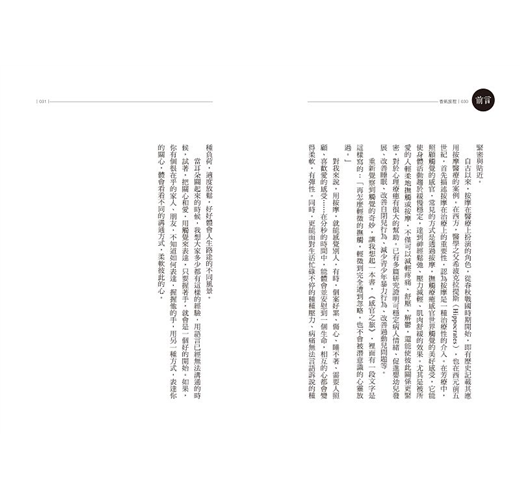 我特別喜歡<柔軟的探索>,她寫到:忙碌賽跑的生活,頑固習慣的緊繃,步步走近的探索,回到包覆的溫柔。文章中她的香氣行旅是愛與香氣的交響詩,是嗅覺與撫觸的協奏曲。芳療果然是愛的旅程,無論您是芳療的喜愛者,或是生命的追尋者,佳宴的香氣旅程邀請我們同行,一起來吧!