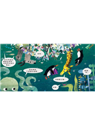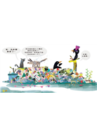 只見故事裡的小貓想盡各種(偷懶的)辦法,就是不願老老實實整理收拾,結果這團「垃圾山」就這樣被牠到處亂塞—作者利用頁面的分割特性,製造空間轉換的趣味感,當讀者翻開下一頁,竟然一下來到了森林,一下又來到了海裡,有別於一般「整理環境」的繪本,作者在畫面的安排上可說是充滿了創意,給予讀者十分不一樣的想像模式。