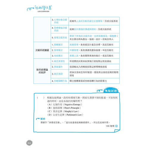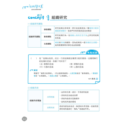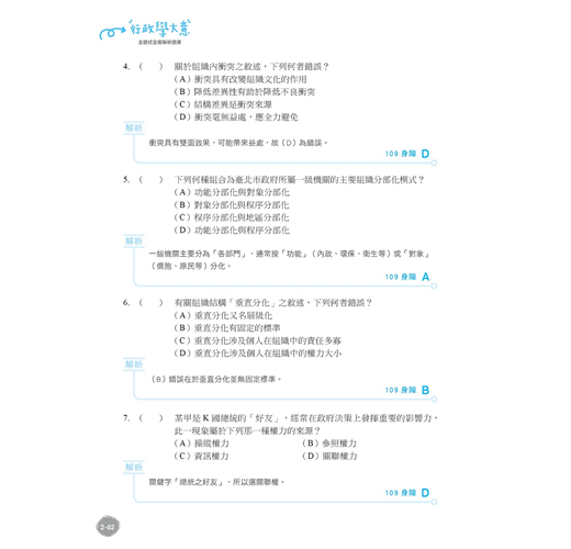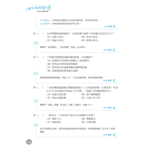 以現今行政學選擇題的考題趨勢來說,題目越來越雜,範圍也越來越廣,傳統題目所占比例越來越少,而新的題目,如企業管理、公共政策、法條類型的題目越來越多,這對單純依賴背誦式或口訣式念書法的同學是非常不利的,故筆者這邊還是建議同學,應當以建立觀念為主,觀念通了,只要看到關鍵字就能刪除錯誤的...
