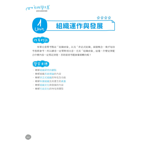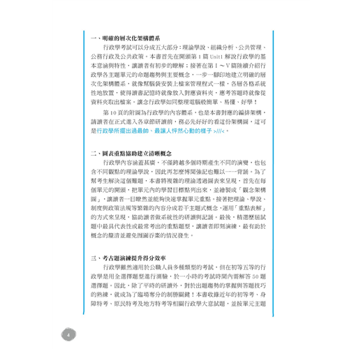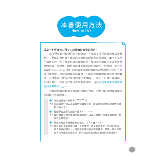 本書收錄前次改版至今為止(109年)的初考、身心、原民、地特及國安五等的行政學大意考題,在解答方面,不以傳統教科書式的解題方法,而仍然採用筆者所堅持的「關鍵字」答題法,希望能培養同學在考場上搜尋題目關鍵字的能力。