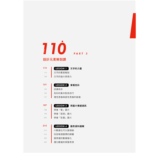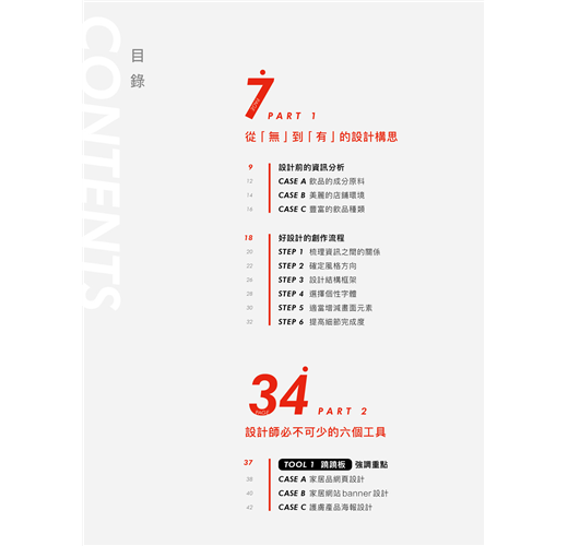 本書以梳理完整的設計流程作為開篇,經由成功與失敗案例的對比和解析,介紹了跟隨元素和傳達狀況而變的各種版式設計手法。然後在此基礎上介紹了六種基本的設計「工具」,再透過介紹文字的基礎知識與字體設計、配色技巧、構圖方式和資料圖表的實際應用,由淺入深地體會設計的魅力;引導初學者從初步構思到完成設計終稿,提升實際操作能力、提高提案過稿率。