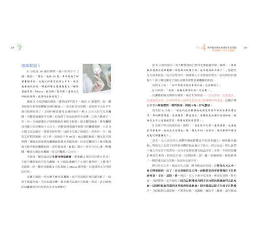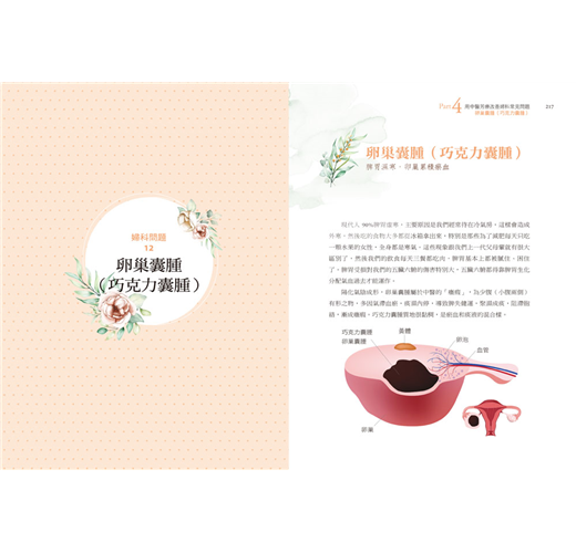 書中從25個真實案例故事,告訴你每個婦科疾病的成因,如:經期頭痛、乳腺增生(乳房纖維腺瘤)、經痛、月經量多、崩漏、非經期出血、月經延長、排卵期出血、慢性盆腔炎、陰道炎、子宮肌瘤、子宮腺肌症、多囊卵巢症候群、卵巢早衰、卵巢囊腫、巧克力囊腫等。並教你透過外用塗抹精油,輔助飲食調整和服用科學中藥,讓你改變體質。