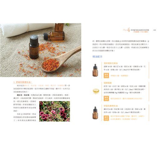 植物的能量來自自然,自然界的能量巨大而且無窮無盡,社會高速發展為人們帶來了豐富的物質,同時也帶來了身體的傷害。精油和中藥都是植物的化身,我在書中也介紹了可以搭配使用的中藥湯方,一起調理身體。植物精油讓我的患者療癒身體,順利懷孕,這是最天然、最健康的療法。