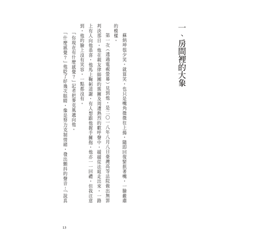第一次(透過電視螢幕)見到他,是二○一八年八月八日臺灣高等法院做出無罪判決那日。他在親友律師團的簇擁及周遭熱烈的歡呼聲中,緩緩從法庭走出來。一路上有人向他恭喜,他馬上鞠躬道謝,有人想跟他握手擁抱,他亦一一回禮。但我注意到,他的臉上沒有笑容,一點都沒有。
