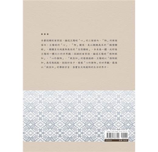 本書從橫剖面來說,論述王陽明「心」的三個面向、「物」的兩個面向。王陽明的「心」、「物」關係,是以親親為本的「親情聯結」,推擴至天地萬物為末的「自然聯結」,本末為一體,此即為王陽明一體之仁的世界觀;從縱剖面來說,論述王陽明「格物致知」、「心外無物」、「致良知」的發展脈絡。王陽明以「格物致知」為思想起點,脫胎於朱子,發展「心外無物」的世界觀,最後以「致良知」的學術宗旨,落實在天地萬物的生活世界中。