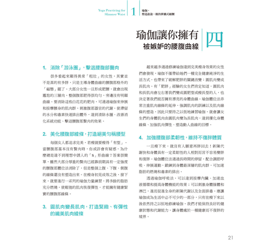 ◎圖文對照,輕鬆易懂:每一招瑜伽體式都有「難度系數」、「體式功效」的精確標註,循序漸進地練習,加上步驟式的動作圖解,不怕學不會。
