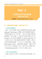 本書重要主題:櫛風沐雨十五年(1995-2009)、年年等待邀請函的「中華台北」觀察員(2009-2016)、重啟作戰(2017迄今)、當前全球衛生治理重要議題、台灣於全球衛生治理的機會