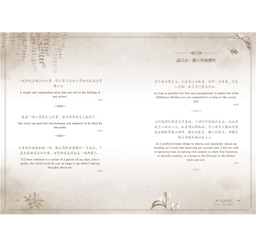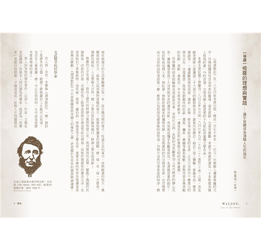 梭羅用豐富的文字營造出一個個自然與人文場景,從他與松鼠、潛鳥的生趣互動,談到瓦爾登湖的四季變化;從荷馬史詩的壯闊,到孔孟儒學的謙遜;從反思當代的勞動處境,到批判美國的奴隸制度,瓦爾登湖有如一面明鏡,供我們檢視自己的心靈狀態,進而擺脫身上的枷鎖。