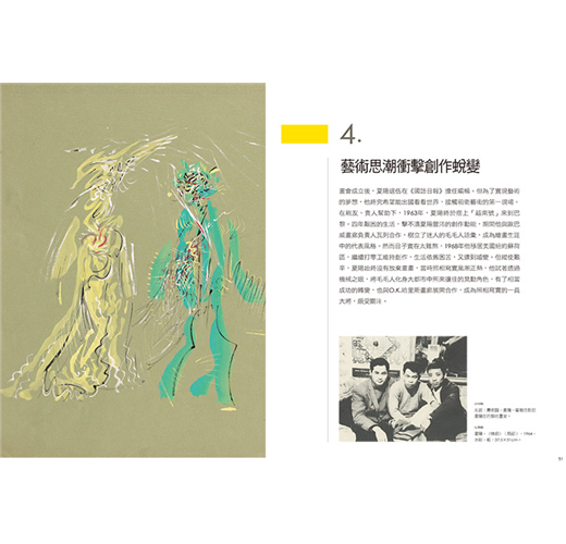 1963年,夏陽初訪歐洲,旅居巴黎期間,他致力於摸索東西融合之道,發展出獨創的毛毛人系列。移居紐約後,夏陽加入O.K.哈里斯畫廊,在蘇荷區參與了當時風行歐美藝壇的照相寫實風潮。1992年,夏陽返回臺北,藝術閱歷豐富的他,回歸傳統民間宗教、神話、寓言故事,以顫動線條重新構成畫面中裂解的毛毛人形,將一切轉變成似是而非的物象。