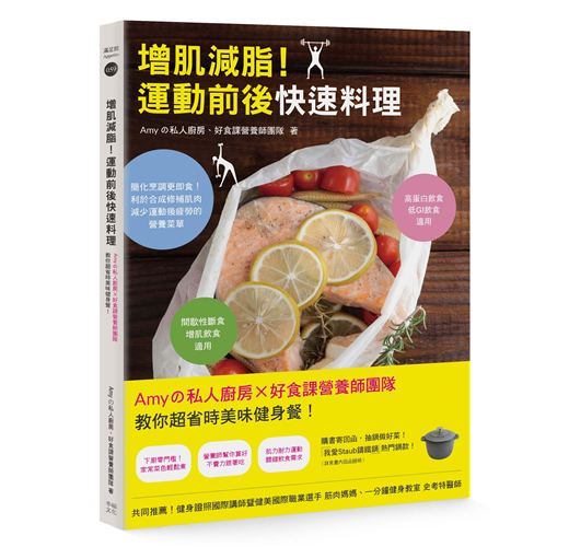 好食課營養師團隊教你『運動料理自由配』,增肌減脂減醣低碳全滿足!瘋健身已成全民運動,大家也知道有計劃地吃、吃對時間與食材,才能讓健身效果發揮到最大,但對於時間有限又想下廚的運動族群們來說,快速煮出營養豐富的一餐並不容易!知名料理網紅Amy老師+專業營養師團隊-好食課聯手合著,精心設計出全家人一起吃、省時輕鬆煮的快速料理!