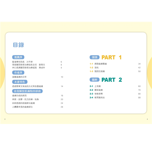 認識憶婷和李瑋許多年,兩位對專業一直抱持極大的熱誠!在臨床治療工作中,總是積極面對患者的問題,給予患者合適的治療計畫,尤其會特別指導患者離開醫療院所後的自我保健與居家運動!兩位作者除了身兼臨床的治療師工作,也承接了許多學校教學,以及企業單位邀約的健康預防、運動傷害保健講座,不僅僅在醫療端面對患者,也同時深入一般民眾的日常生活中,衛教亞健康的族群,讓民眾遠離身體不適,進而達到預防保健的目的。同樣身為一位臨床工作者,最希望的就是可以推廣預防保健知識,落實在民眾的生活中。當我受邀閱讀本書,發現內容相當豐富實用,除了常見部位痠痛的成因及說明以外,更提供了多樣化的緩解辦法,包含伸展運動、自我肌筋膜放鬆、肌力訓練,以及肌能系貼紮。大量的動作示範及操作圖片,容易學習快速上手,非常貼近民眾需求。書中提供了數種的緩解方法,可以依時依地做合宜的選擇。若是身邊沒有貼布時,讀者可以選擇進行肌肉伸展、肌力訓練,而若是不巧沒有時間或空間進行運動時,便可以改用肌能系貼紮來處理。簡言之,本書整理了日常生活常見肌肉骨骼問題,以及運動傷害的處理與預防,誠摯地推薦給大家這本實用易上手的工具好書!
