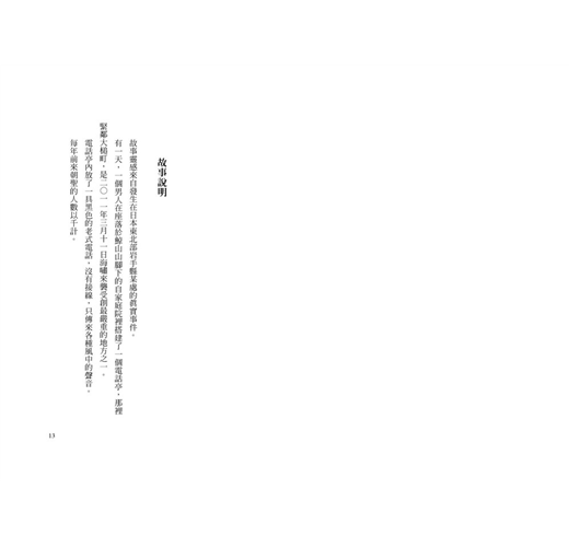 ★療癒的存在:本書透過書封和文宣提供了一個有形的電話亭形象,讓讀者在閱讀小說之外,透過一個具體存在的物品(電話亭),作為想望、觀看的形象,一個可以實現傾訴的儀式場所。搭配故事人物的人生故事,提供讀者勇氣面對自身的思念或飲恨,透過電話亭的存在,進而達到療癒的作用。