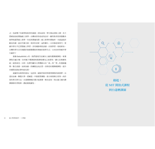 ▍此書文筆流暢,平鋪敘述作者六年來推動台達磨課師的過程及經驗,並蒐集整理了師生意見。無論是對未來國內教育的發展關懷者、有興趣製作線上課程者、或者利用線上教學及學習的師生們,都可以在此書中找到需要的資訊和珍貴的經驗。 ――李定國 (中研院院士、中山大學研究講座、前中研院物理所所長)