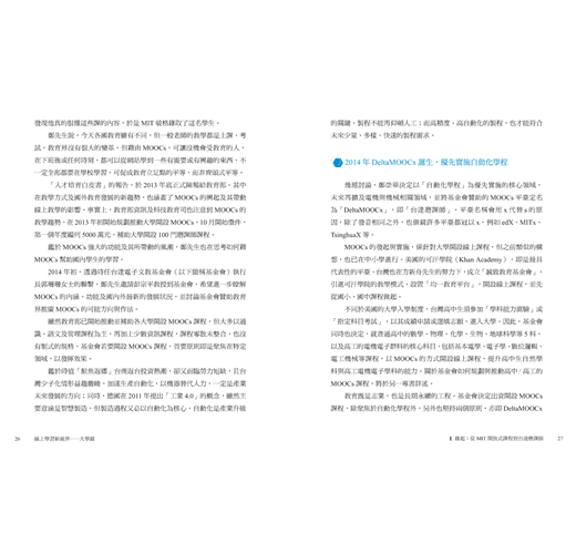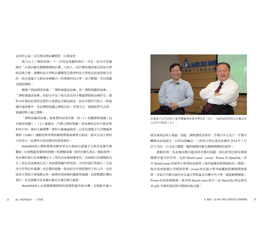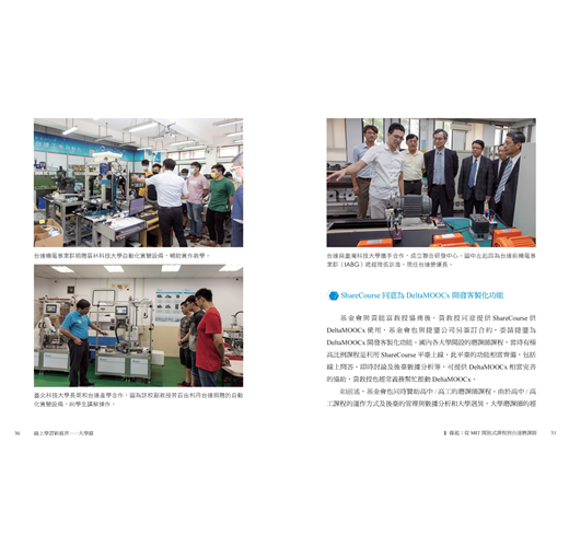 本書記錄推動DeltaMOOCx大學自動化學程的背景、規劃、執行、管理及實施成效。經由教師及學生之訪談,分享教學經驗與學習心得;也就平臺運作與課程經營之經驗,討論線上學習對未來高等教育的影響,並提出落實磨課師教學的建議。
