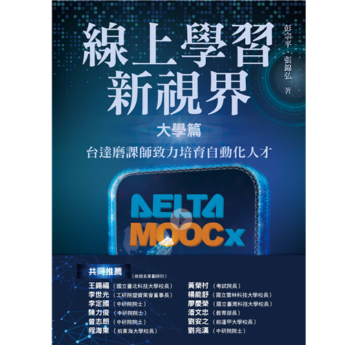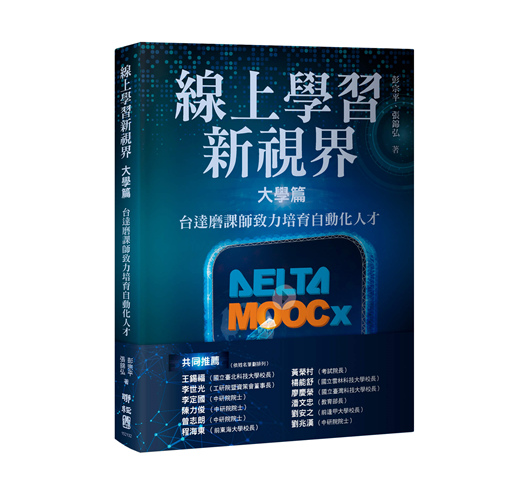 ▍2014 年台達電子文教基金會啟動 DeltaMOOCx 課程計畫,本校以實務創新教學以及在自動化工程的專業,有幸參與課程規劃、錄製、開設與推廣。這個計畫開啟國內磨課師專業課程的新頁,也具體落實教育平權的理念。「看似尋常最奇崛,成如容易卻艱辛」,此書記載彭宗平教授推動計畫的過程與課程亮點,對未來線上學習的推展,深具啟發意義,謹推薦給所有關心教育的讀者。 ――王錫福 (國立臺北科技大學校長)