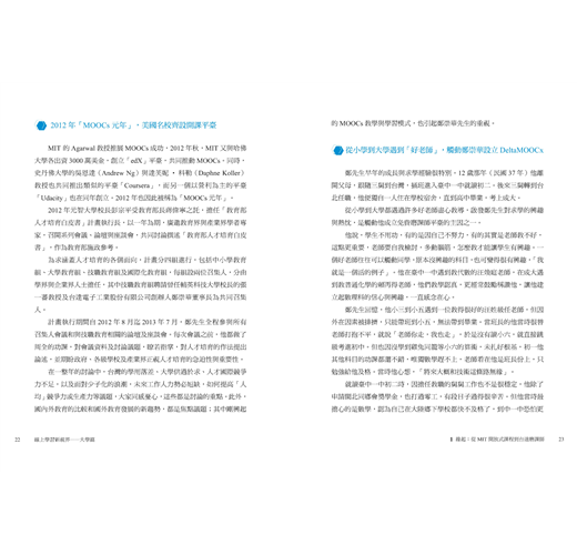 ▍本書道出台達磨課師(DeltaMOOCx)之心路歷程,可見台達電子創辦人鄭崇華先生的用心,主持人彭宗平教授的高效率領導。在課程設計、教師選擇、教材錄製各方面均展現專業水準,成效卓著。鄭先生設立線上教學的初衷,就是讓好老師有更寬廣的教學平臺推廣給更多學生,落實無遠弗屆、有教無類、處處是教室的學習模式。這本好書探討許多議題,涵蓋學程的選擇、打破載具的客製化平臺、訓練老師成為學生所愛的磨課師,更以此建立華人的世界品牌,善盡企業之社會責任。 ――程海東 (前東海大學校長、前伊利諾大學(香檳校區)教授、前澳門大學副校長)