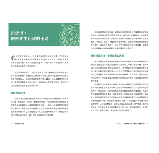 不僅撫慰了自己,還用湯照顧家人,緩解老公化療的不適「我不確定是否是因為這一鍋鍋的煲湯,讓我老公從原本被醫生宣判的三個月生命延長至三年,但我相信大自然裡的原型食物有它們的力量,能帶來滿滿的營養,讓老公化療期間精神與體力幾乎和一般人無異……」