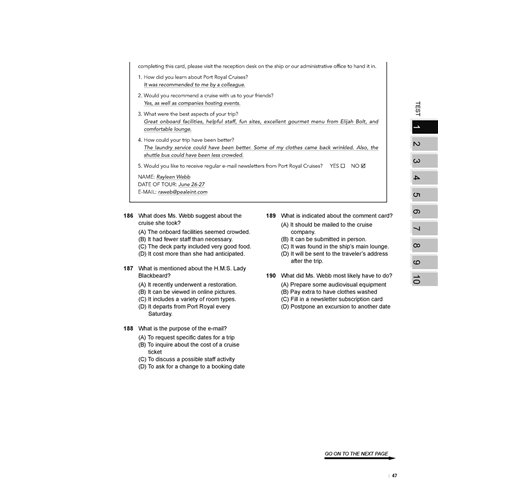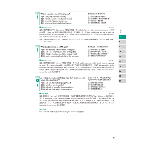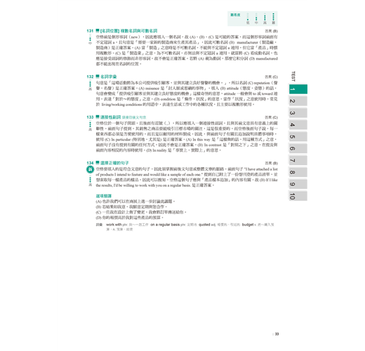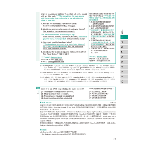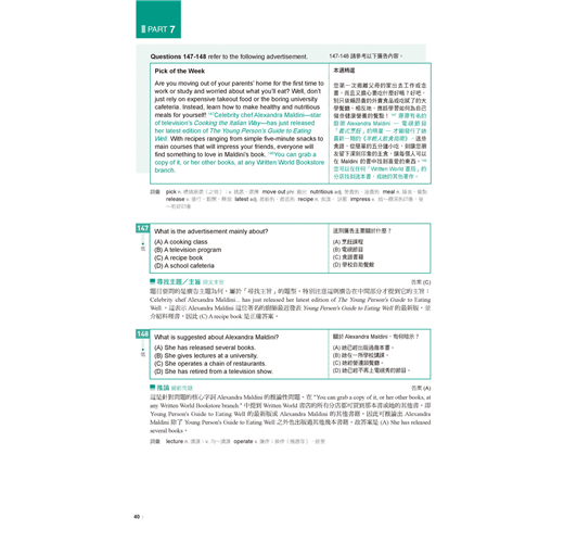 除了主要模擬測驗內容,書中還有種種設計讓考生使用起來更加便利。相關的設計有:目標設定評量表、自我檢測表、答案紙、分數換算表。除了詳細解析外亦附有題目及中譯,省去兩書對照的麻煩,而且特別以不同的顏色標示出解題線索,便利讀者抓取重點。