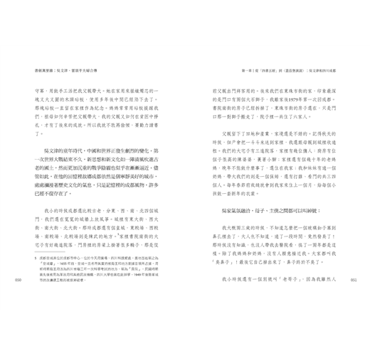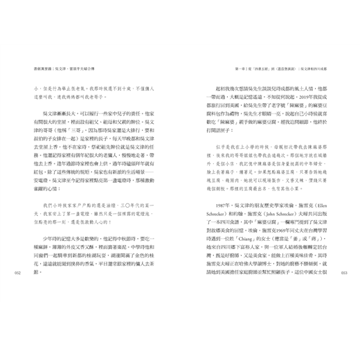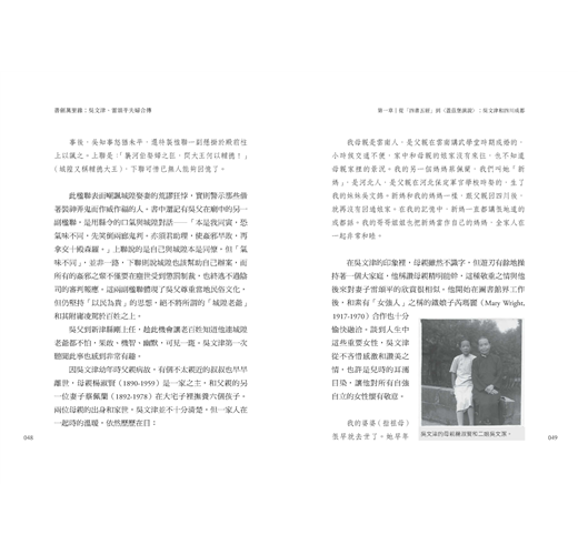 人一樣,已經沒有了傳主和作傳人之間應有的距離;二來替吳夫婦作傳,主要是介紹他那一個時代,譬如第二次世界大戰,對我們這些七十歲以上的人尚耳熟能詳,對二三十歲的讀者而言就恍如隔世了,也許對美國那時是中國的敵國還是盟友都不甚清楚。因此應以年輕人的角度回顧才對。