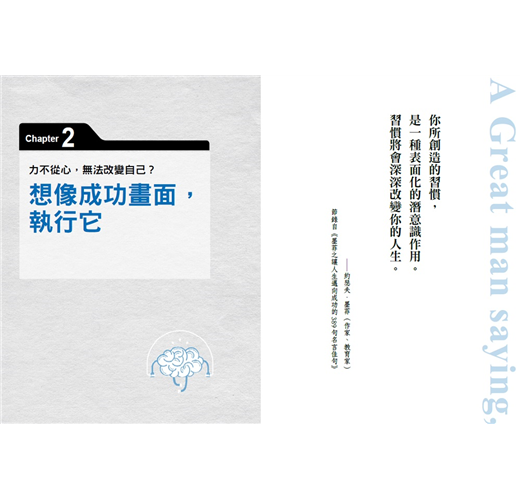 人類的行動全都取決於習慣,因此只要養成好習慣,就能以更快的速度迎向成功;反之,若無法從壞習慣中抽身,就會陷入負面的迴圈。就某種意義而言,這個說法相當中肯。