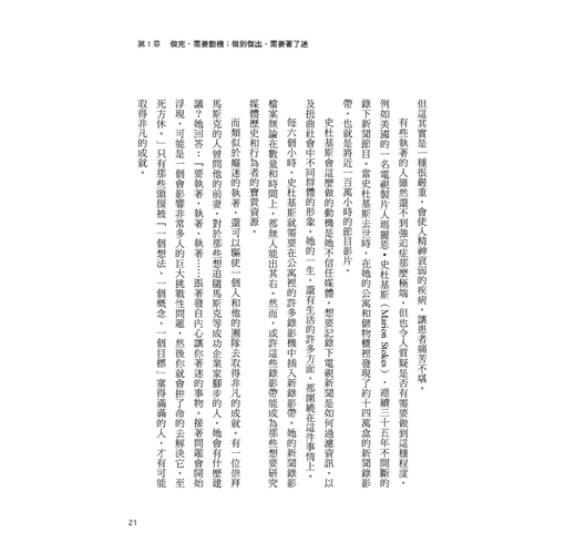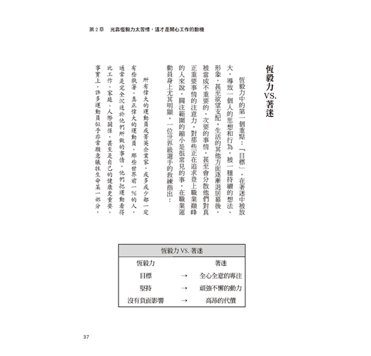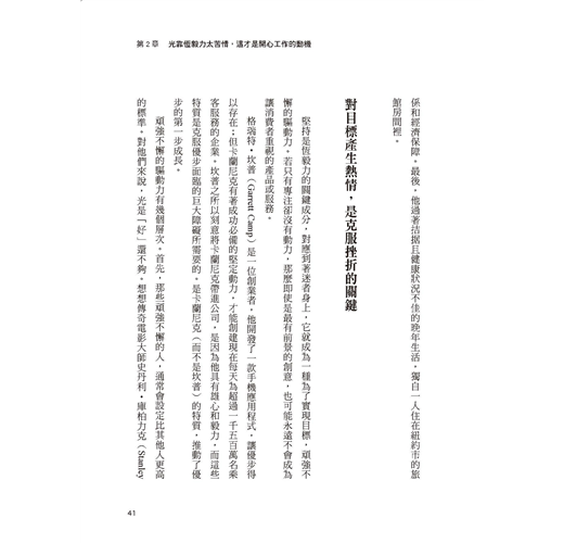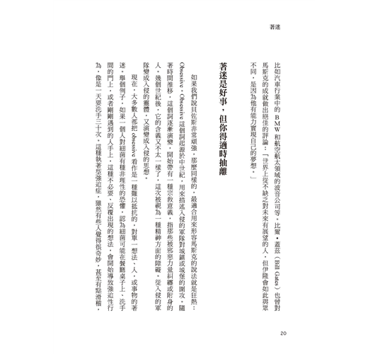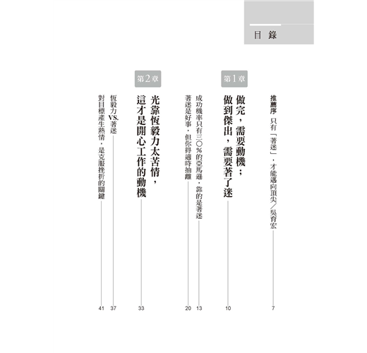 在努力、專注、堅持,這些老生常談的元素背後,作者點出了一個我過去不曾想過的觀點:「著迷」。邁向成功之路雖然要付出代價,但是這些代價不一定是拚命加班、苦情賣力,這些代價也可以伴隨著樂趣,用愉快、甘願的心情去實踐它。