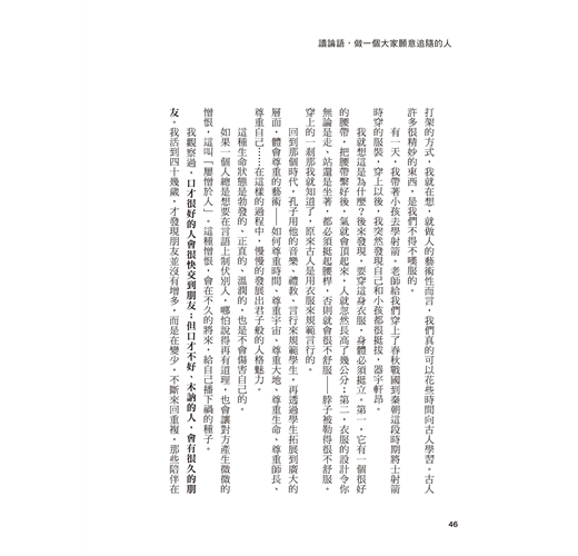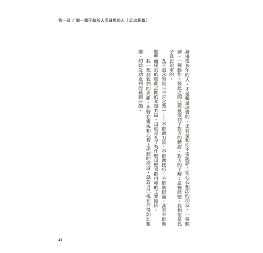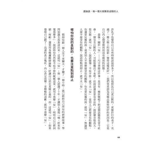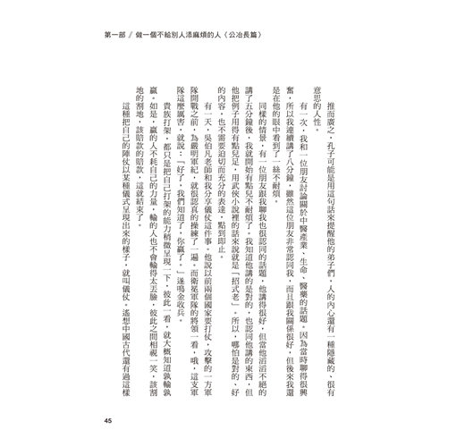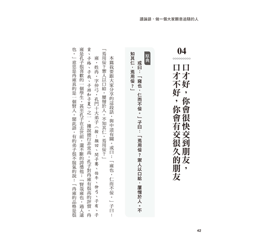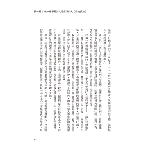 大學以後,如何在複雜的人際關係中自我定位,深深困擾著我。攻讀中文所碩士的期間,我們坐在教室裡,用各種深奧的學術名詞討論著孔子……分神的我翻著《論語》一條條原文,某幾句突然打中了我──他說的正是我當時的人際困惑,他說的正是一種人可以選擇的更好行為標準。