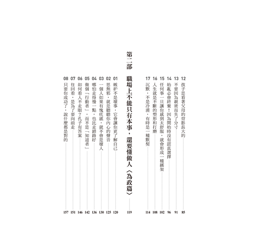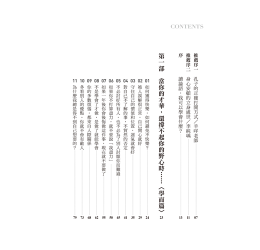 本書以清晰的語言、通達的條理,在千年後的今天,解答了距離你我如此接近的人生課題。從中可知,若能守住自我價值並站穩崗位前行,事實上已然走在正確的道路上,至於過程中是否開心、失意,那終將成為回頭遙望時的一道風景,掛齒與否?我想那不過是一抹坦然釋懷的微笑。
