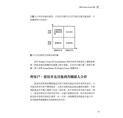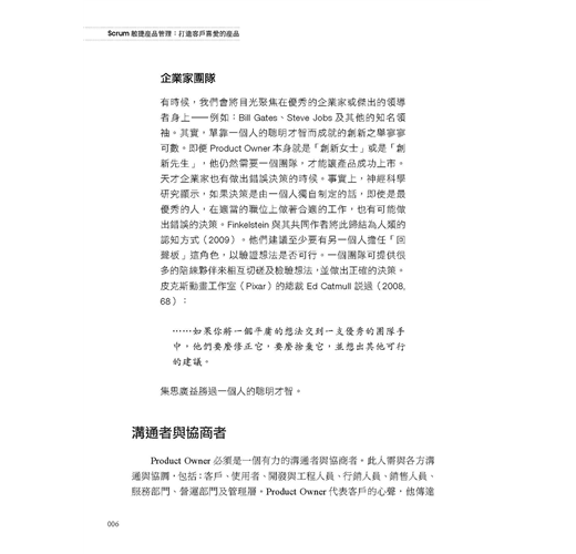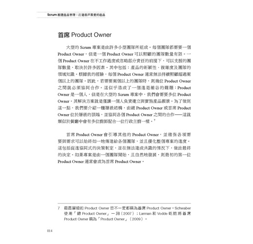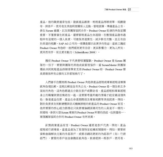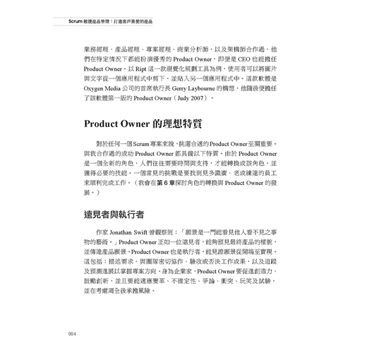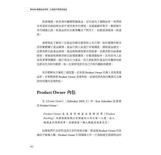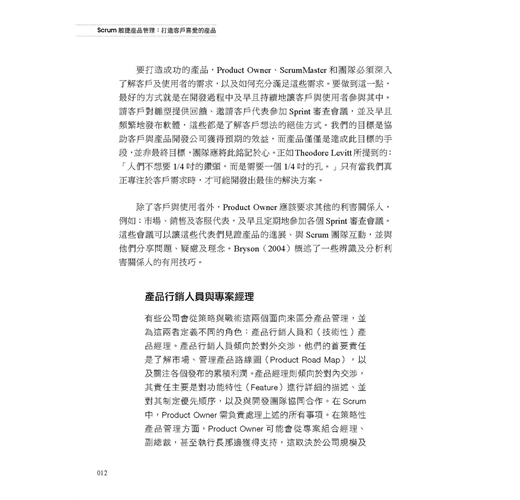 對於擔任 Product Owner或有意加入Product Owner行列的人們,以及對於建立敏捷產品管理有興趣的管理高層及教練們,本書都是不可或缺的參考來源。