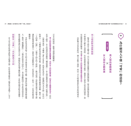 閱讀本書,可以讓各位讀者釐清異性言行舉止背後的「真心話」,跟異性相處也會更加輕鬆愉快。只要掌握男女心理上存在的差異,就算面對異性採取難以理解的思維模式或是行動,相信各位也可以一笑置之吧。
