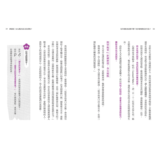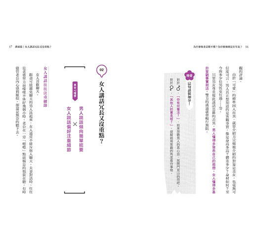 如果我們搞不懂諸如此類的「兩性差異」,便會動輒發生像是「你講話為什麼不把臉轉過來!」、「妳都沒在好好聽我講話」一類的溝通衝突。