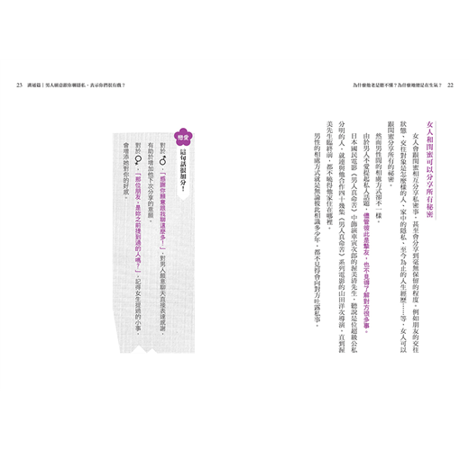 很多男人與女人聊天時,內心都會有種難以言喻的彆扭感吧。與其用彆扭來形容,不如說男人跟女人談話時,往往會覺得很不耐煩,我想女人對男人也有相同感受。會有這種現象在所難免,畢竟男人和女人的談話思維根本截然不同。