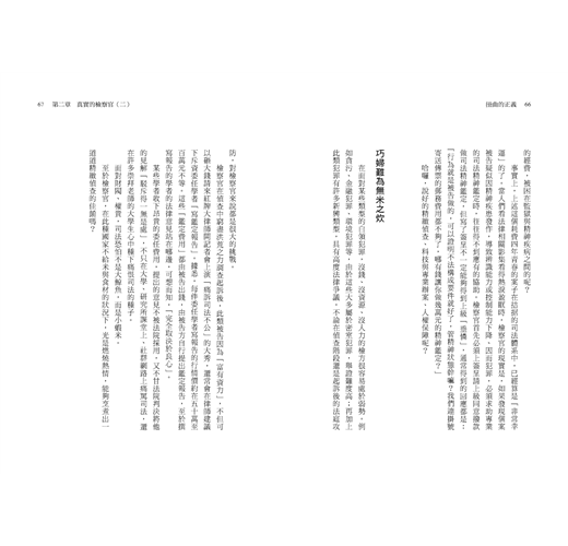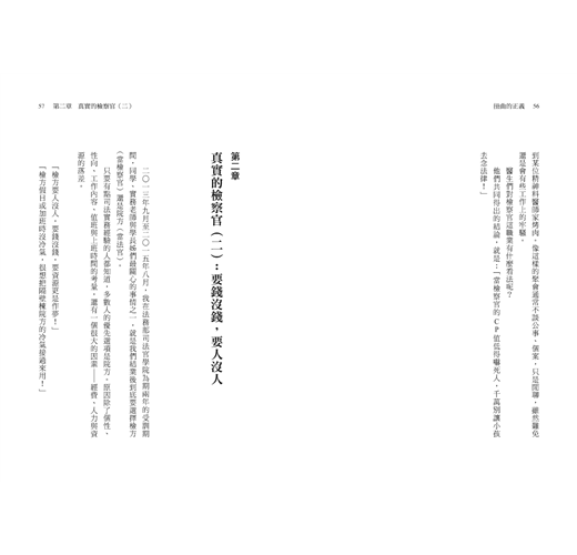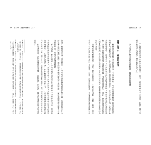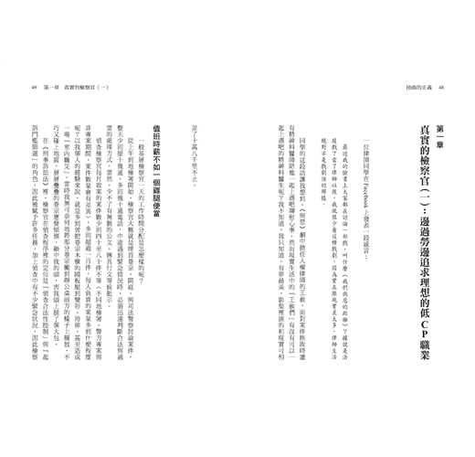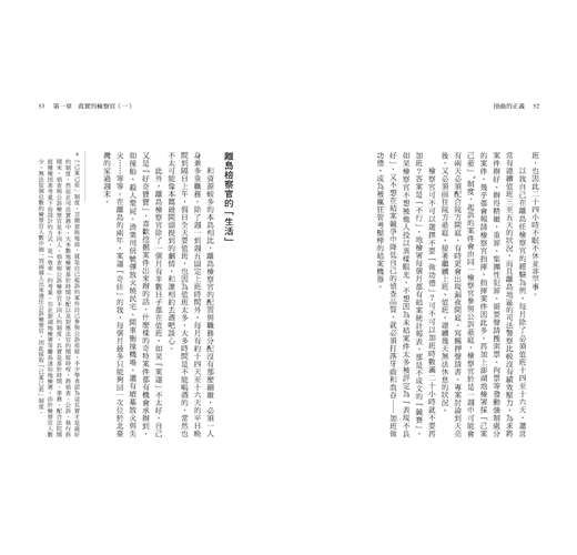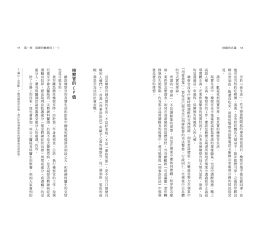 這本書寫的,也是對臺灣社會「包青天文化」的不同意見書,揭露的是在「司法正義」光輝的背面,不被見的政策的歪斜、資源的匱乏、檢與警在扭曲制度中相互埋怨卻又唇齒相依的面貌……身在其中,我們雖然號稱「正義使者」,卻也可能逐漸成為不再探問「何謂正義」的作業員……轉身正面問題,然後向人群探求吧、向內心的真意探求吧,道路或許就在此方。