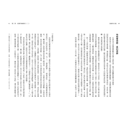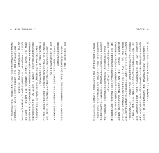……這本書,匯集、重新整理了我在鳴人堂的專欄以及其他投書與演講討論過的議題。專欄討論的核心是刑事司法與偵查領域問題,所以有許多法律專業詞彙以及實務術語,在這本書中由非法律領域的編輯來幫忙調整,使文字盡可能地淺顯白話,期待這能夠作為一本推廣、讓更多人了解實況、看清問題全貌,從而思索改善的書。