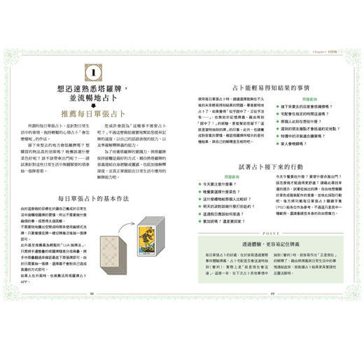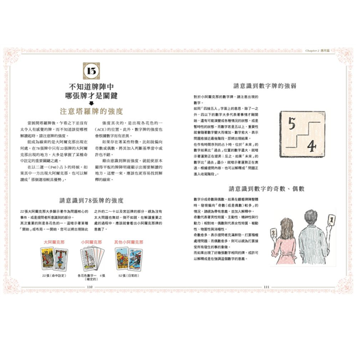 書中以對比畫面整理出「相似牌面的不同寓意」、「圖畫中元素等細節」、「花色與數字」等各個實占上好運用的切入點,拓增解讀的面向和線索,