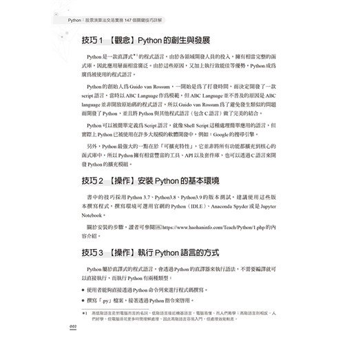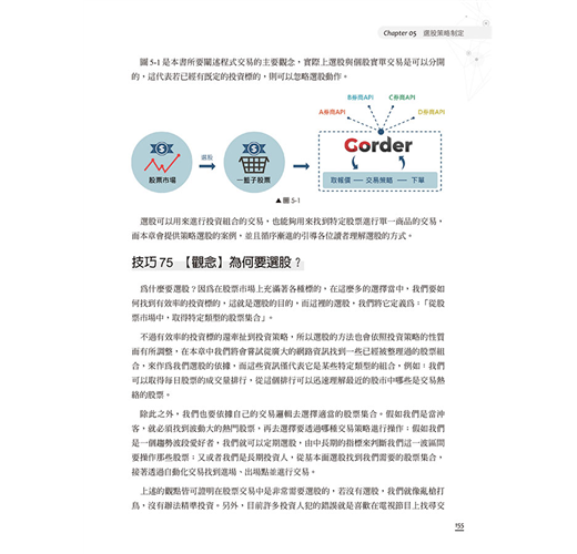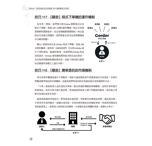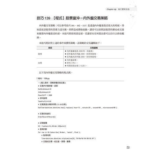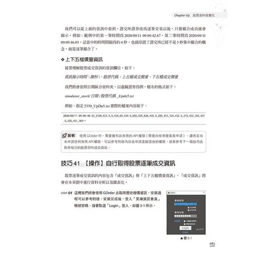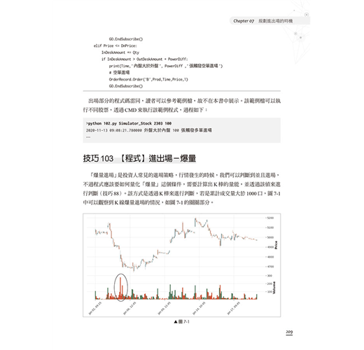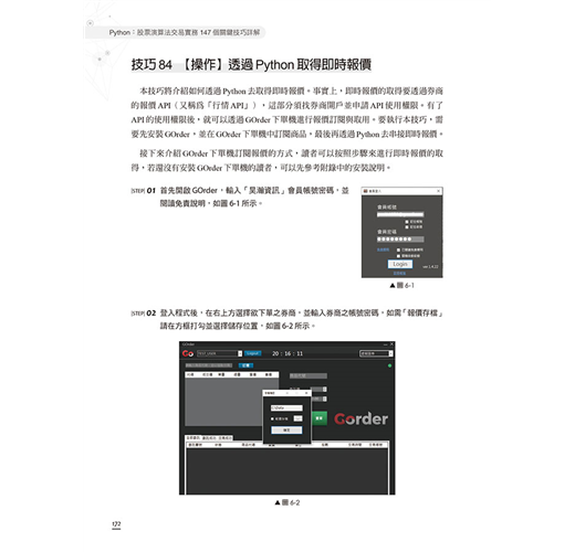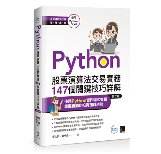 有鑑於此,本書使用Python作為程式開發的語言,其本身操作簡單、易於上手,是切入程式交易的方便工具。本書中的內容均可實作,搭配下單程式,可連接多數的券商進行實單交易。