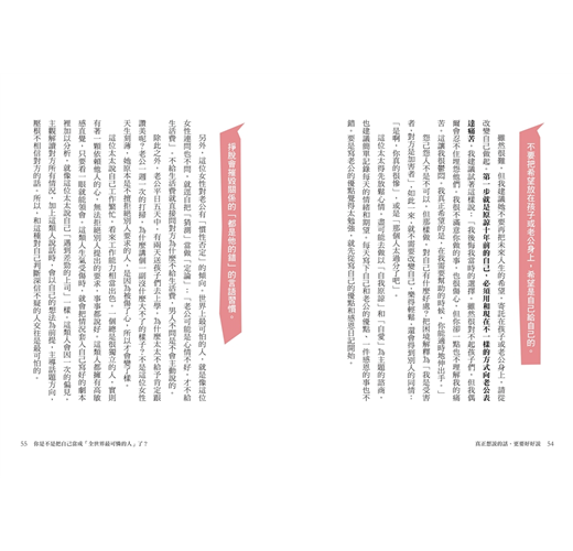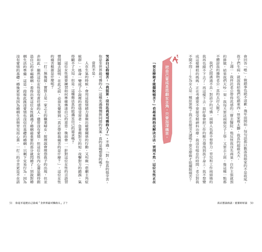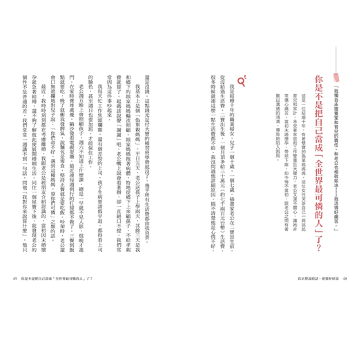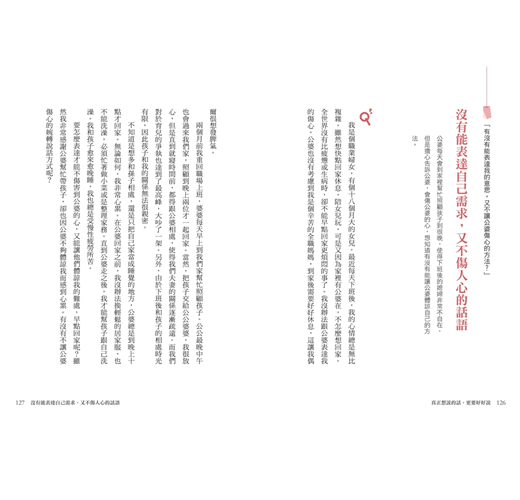 作者以平易近人的文筆,細膩地抓出案主的負面情緒,有層次地分析其受苦的心態,精準地點出真正的問題所在,打入人心,將他/她拉回現實面,激發理性思考,有架構且詳細地引導溝通方向與方式。