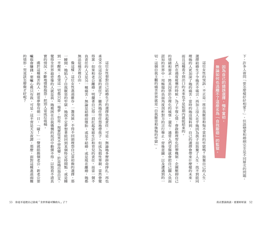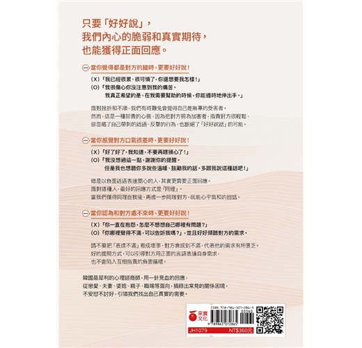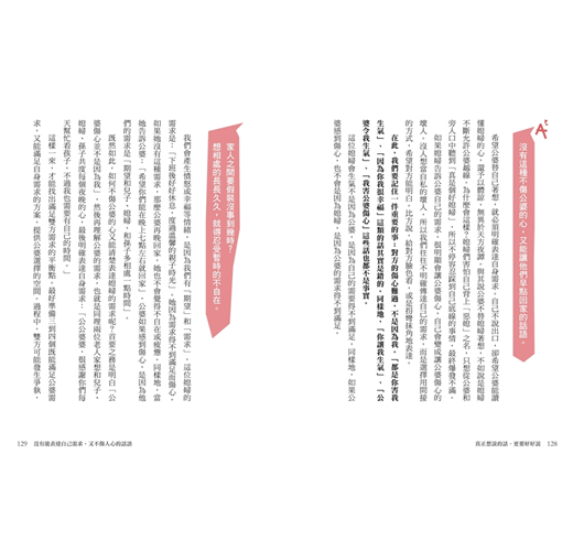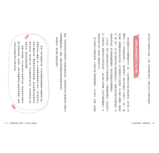 「作者以淺顯、甚至犀利的案例告訴我們:『坦承面對自己的感受,理解這不是誰的錯,只是自己的需求未得到滿足』,一旦能清晰認知到這個概念,才有可能把話好好說,也好好愛人、愛己,建立你所渴望的人際關係~」